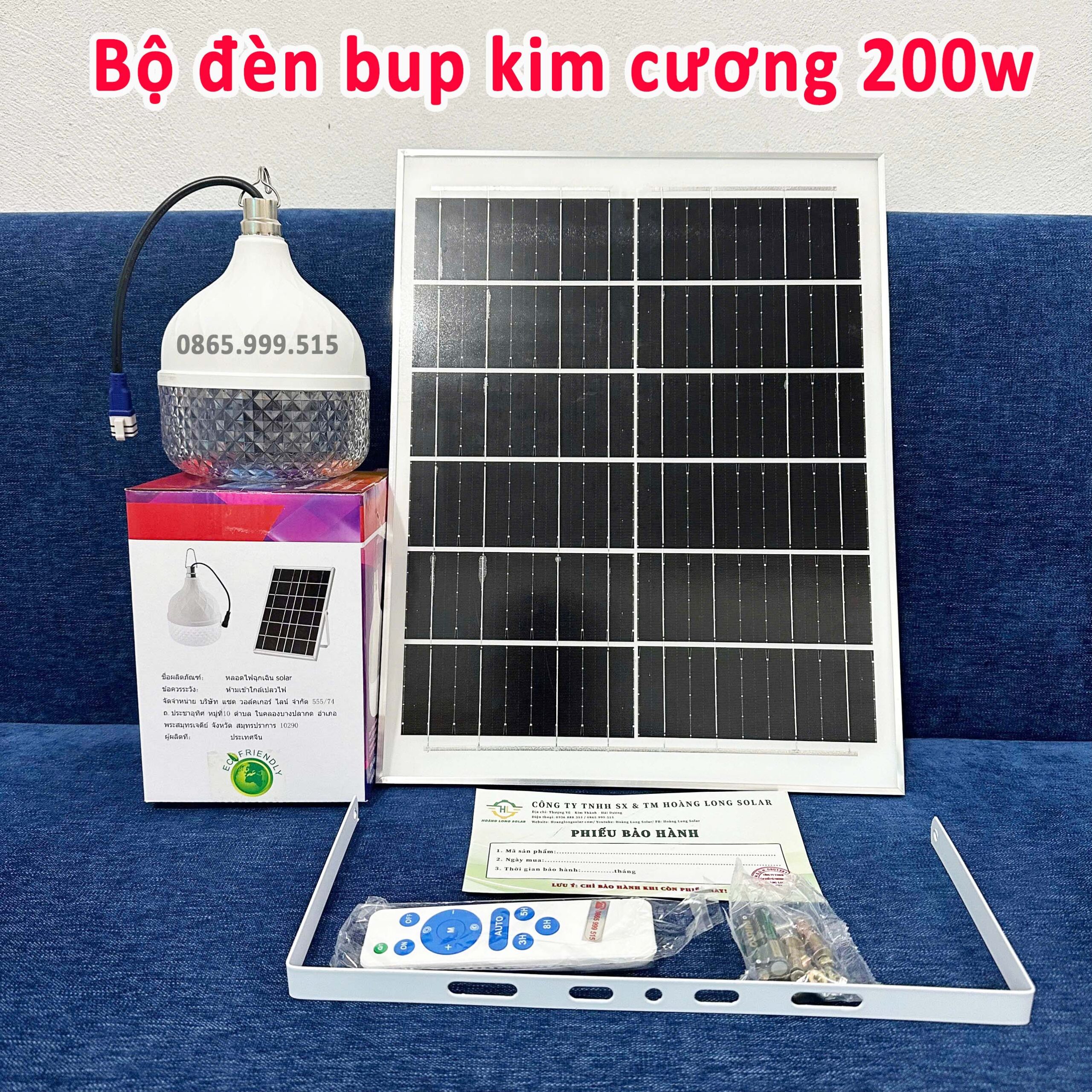 Phụ kiện kèm theo : Thân đèn, tấm pin (dây dài 5m), giá đỡ, điều khiển, bu lông ốc vít, thẻ bảo hành